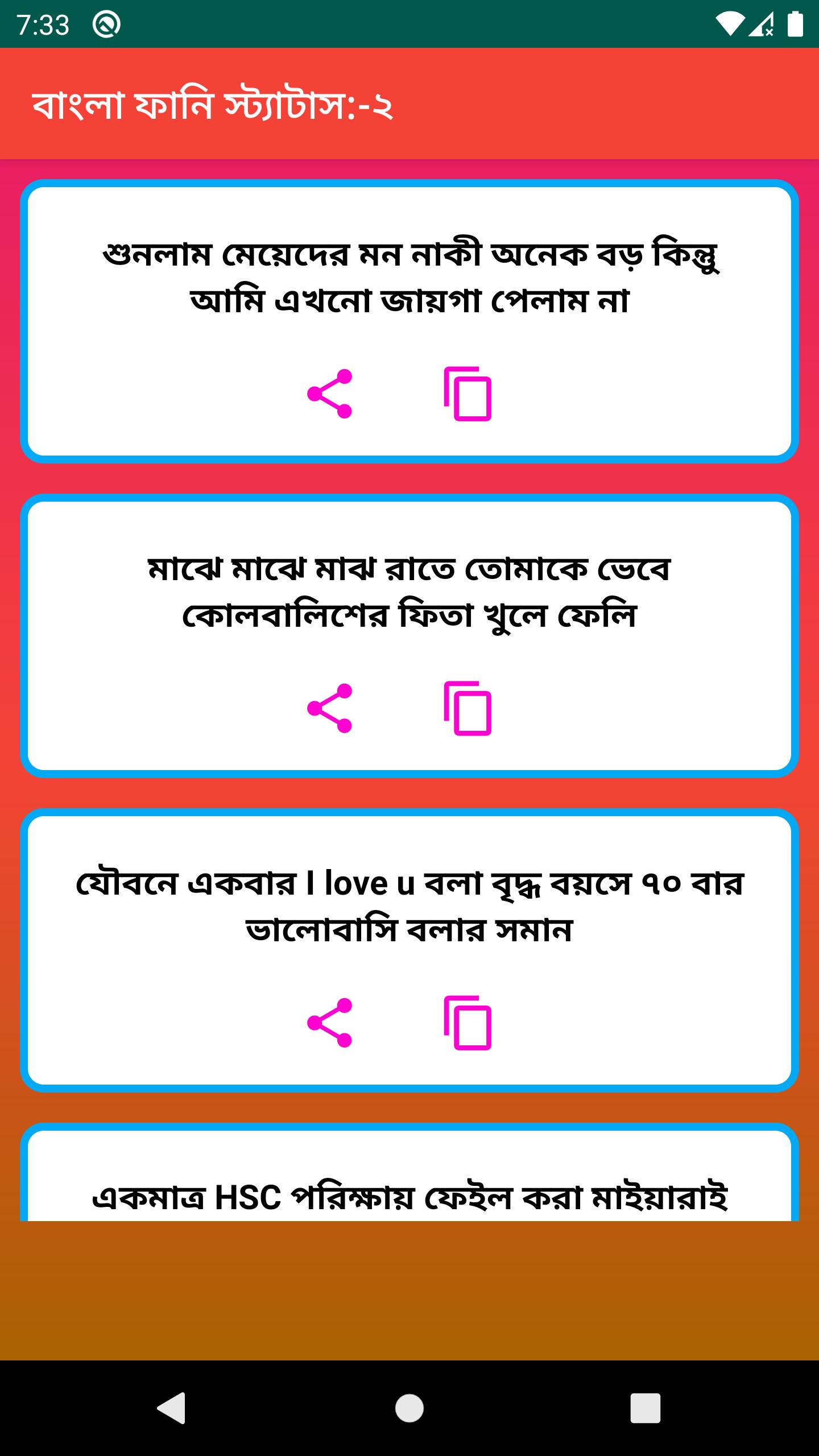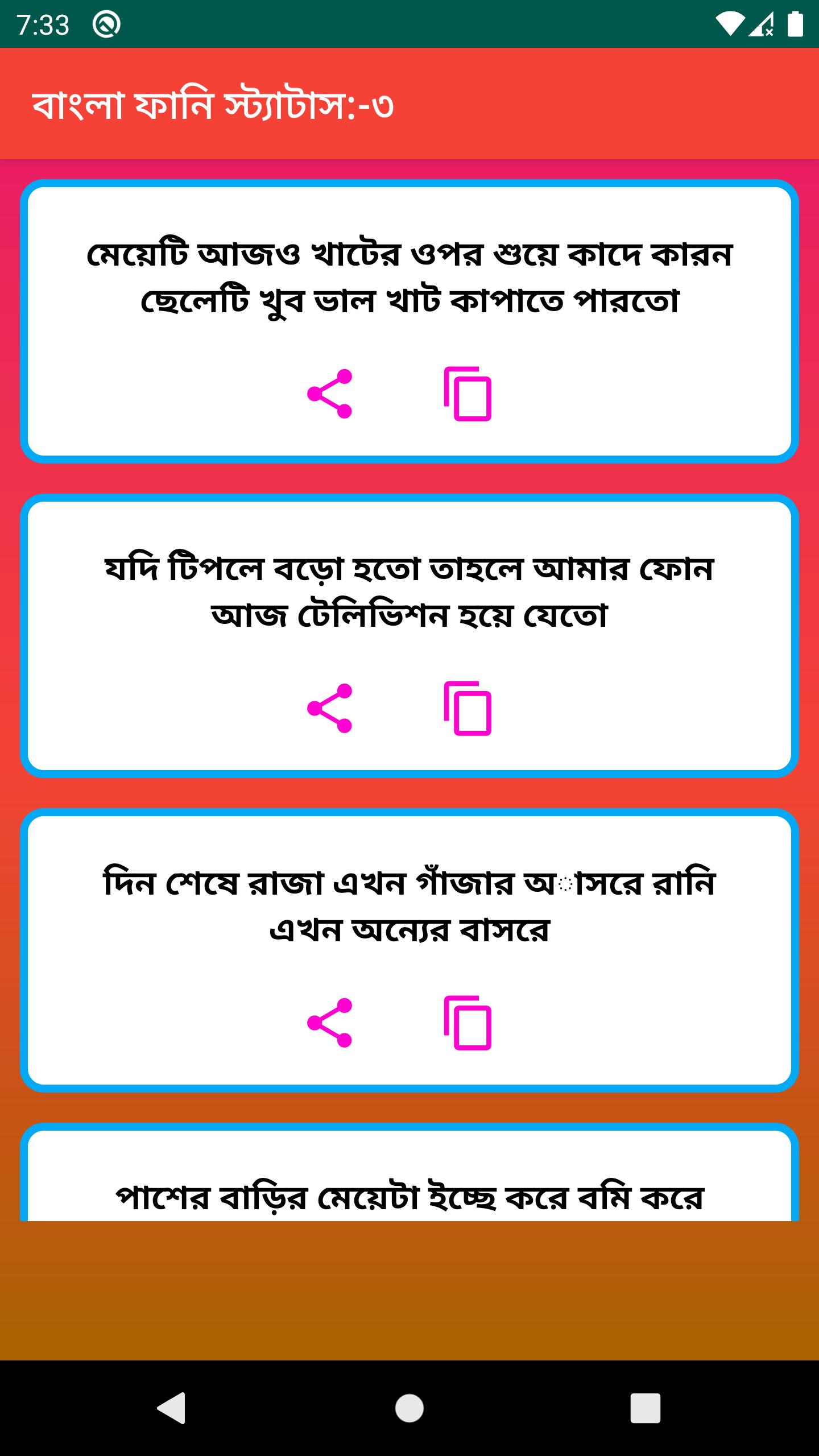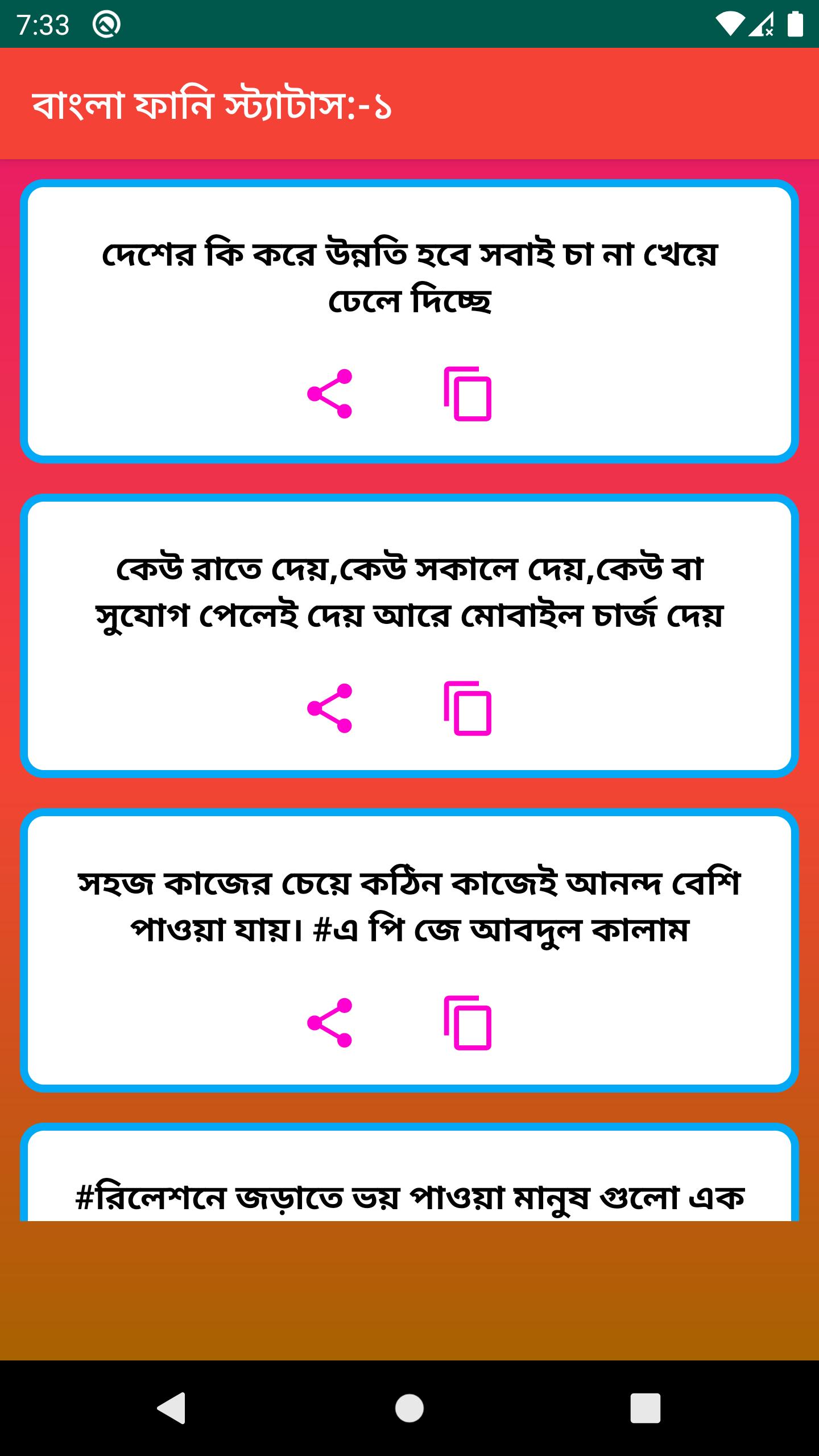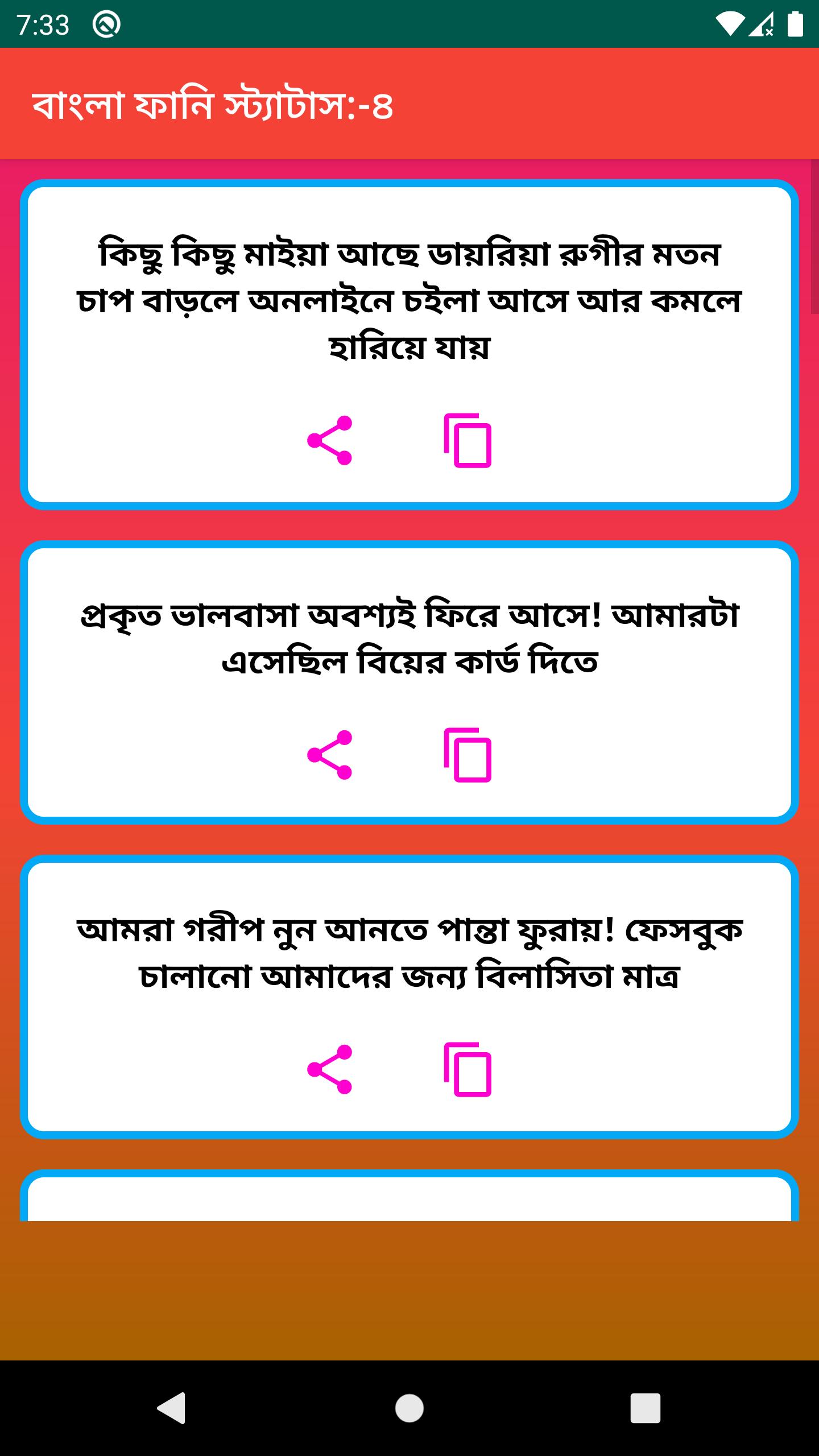 Best New Bangla Funny Status এই apps এর মাধ্যমে আপনি আপনার পছন্দ মতো সকল স্ট্যাটাস গুলো অতি সহজে সবার সাথে শেয়ার করতে পারবেন | এবং এই apps এর মাধ্যমে আপনি আপনার পছন্দ মতো সকল স্ট্যাটাস গুলো অতি সহজে কপি করতে পারবেন |