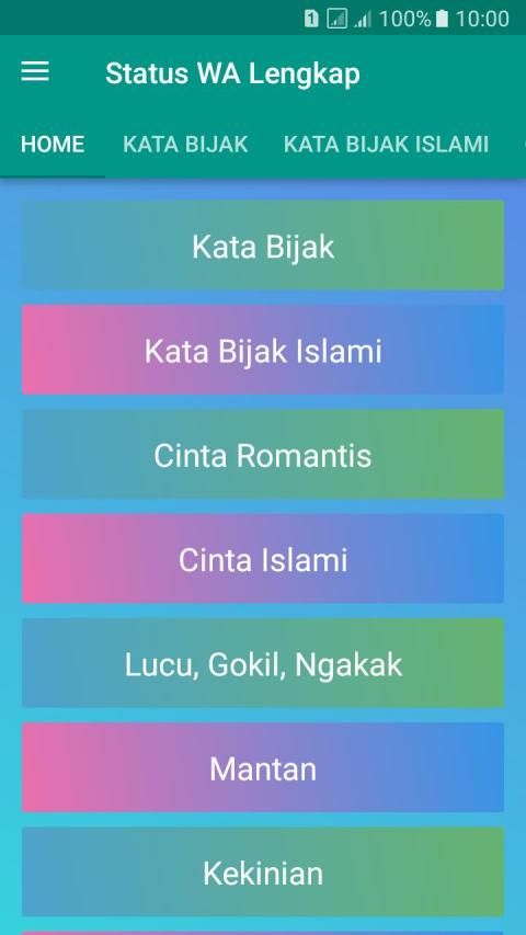 Status wa kata kata mutiara, status romantis, bijak, sedih, rindu, islami dan masih banyak lagi. Semua ada dalam aplikasi ini. Aplikasi ini memiliki lebih dari 10 kategori status whatsapp yang bisa kamu pilih dan kamu share ke teman-temanmu.