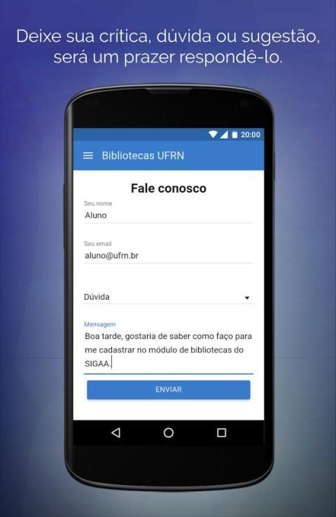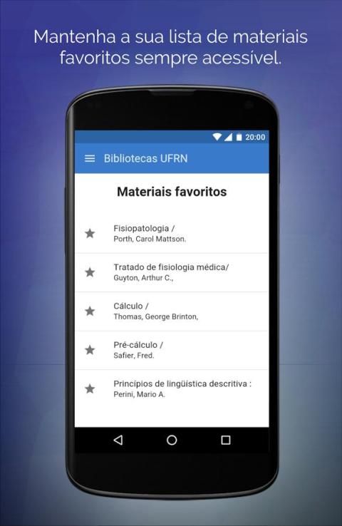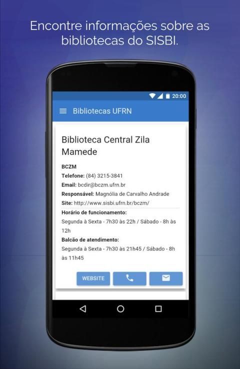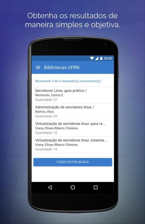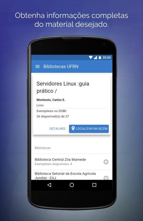 UFRN की संपूर्ण शैक्षिक समुदाय के लिए केन्द्रीय पुस्तकालय जिला Mamede द्वारा प्रदान की गई है, आसानी से और निष्पक्ष UFRN लाइब्रेरी सिस्टम में उपलब्ध सामग्री खोजने के लिए छात्रों की मदद करने के लिए लक्ष्य आवेदन।