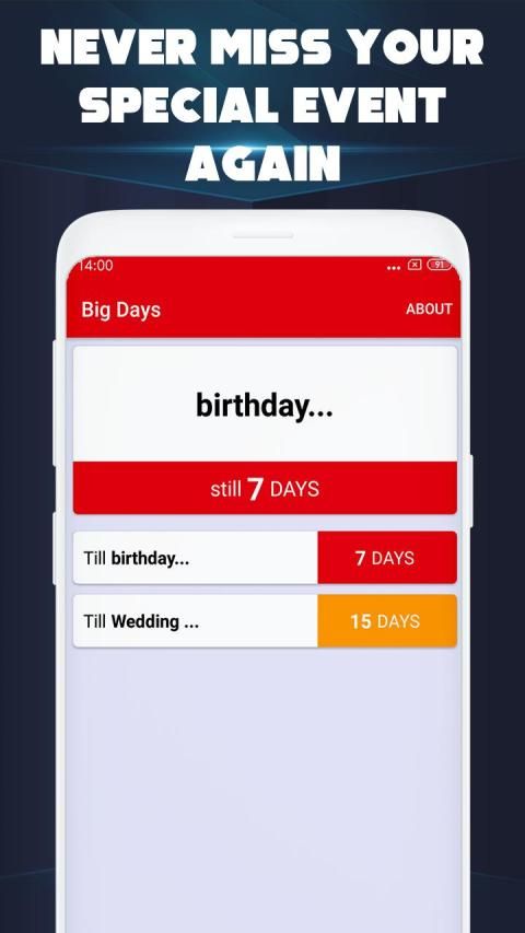 With Big Days you will never miss another birthday, retirement date, salary, anniversary, graduation event, wedding, delivering a baby (pregnancy), exam, serving the army, football/soccer game, summer holiday or any other important date, including shopping sales event.