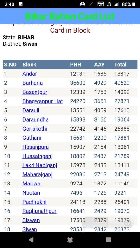 Bihar States Ration Card Online Search Android App is developed to find online ration card, BPL List, AAY List, PHH, NFSA List, Non-NFSA List, e-Ration Cards issued by food department Bihar Rajya. This is all in one android app for APL Ration search, BPL Ration Card search, BPL list, AAY list, NFSA list, Ration card status, Ration dealer status, FPS code name, FPSA owner location. All information displayed in this app is loaded from the website of food and supply department, Bihar Rashan Card List 2019 - epds bihar list