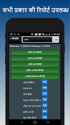 ✓ रिपोर्ट: सभी प्रकार की रिपोर्टें उपलब्ध हैं जैसे उत्पाद वार, बिल वार, स्टॉक अपडेट, उपयोगकर्ता वार, ग्राहक वार, ग्राहक क्षेत्र वार, उत्पाद और श्रेणी बिक्री, ग्राहक बकाया, पूर्ण स्टॉक, दिन समाप्ति, ग्राहक पूरा ऑर्डर इतिहास आदि।