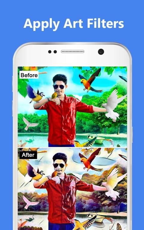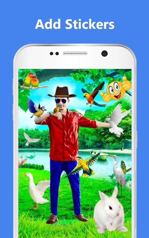 Take Photo or select photo from your image gallery in this Birds Photo Editor and apply birds or any other stickers. Adjust the size of the stickers, flip it if necessary and save the final image.