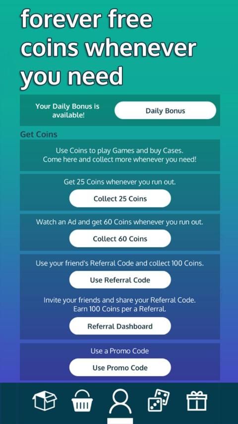⦾ You can collect free coins each time your account balance reaches zero by simply pressing a "Get Free Coins" button.