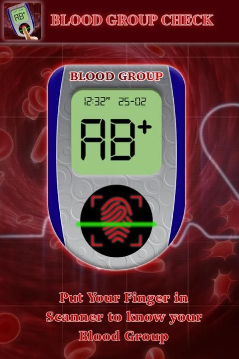 रक्त समूह चेकर आवेदन में अपनी उंगली स्कैनिंग द्वारा बस अपने रक्त समूह की जांच करता है। थोड़ी देर के लिए स्कैन पैड पर अपनी उंगली डाल दिया और परिणाम के लिए प्रतीक्षा करें। आपके रक्त समूह एक समय के बाद दिखाया जाएगा।