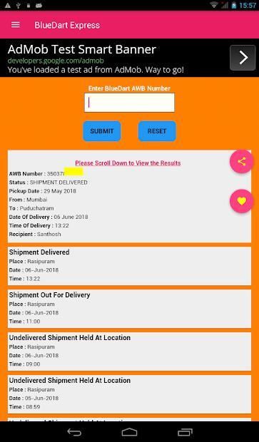 4. Click on the Share Floating Button to Share the BlueDart Express Shipment Tracking Result.