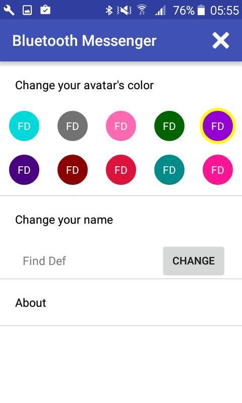 इस एप्लिकेशन को आप अपने खुद के चैट रूम कि लोगों के आसपास ब्लूटूथ कनेक्शन के माध्यम से में शामिल हो सकते हैं बनाने के लिए अनुमति देता है।