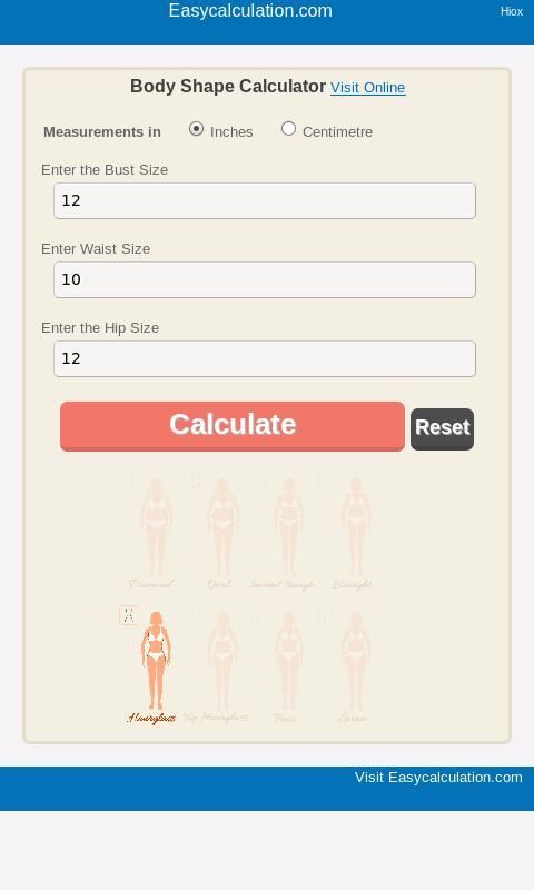 इस ऑनलाइन शरीर के आकार कैलकुलेटर का उपयोग करें (सीधे, नाशपाती, चम्मच, hourglass, शीर्ष hourglass, उल्टे त्रिकोण, अंडाकार, हीरा) आपके पास शरीर के किस प्रकार खोजने के लिए।