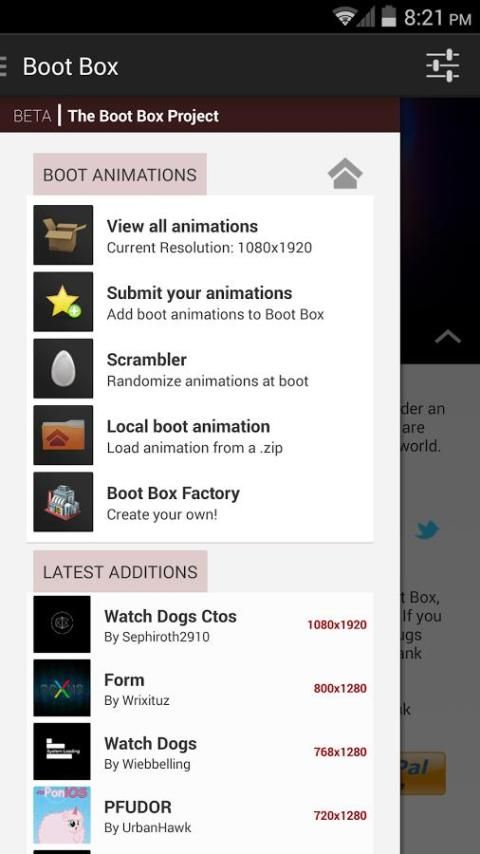 बूट बॉक्स परियोजना को आसानी से सुलभ बूट एनिमेशन के एक बड़े डाटाबेस का उत्पादन करना है कि एक समुदाय परियोजना है। क्या बूट बॉक्स परियोजना शक्तिशाली बनाता योगदान करने की क्षमता है, उपयोगकर्ताओं को बूट बॉक्स app से सीधे उनके बूट एनिमेशन प्रस्तुत कर सकते हैं।