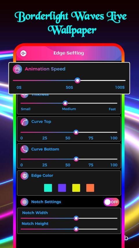 बॉर्डर लाइट वेव्स लाइव वॉलपेपर ऐप आपको ऐनिमेशन स्पीड, मोटाई, कर्व टॉप, कर्व बॉटम, एज कलर जैसे एज इफेक्ट्स सेट करने की सुविधा देता है और अधिक मनमोहक एज इफेक्ट्स बनाने के लिए Notch सेट करने का सबसे अच्छा विकल्प है। एक एप्लिकेशन जो एनिमेटेड लाइव वॉलपेपर थीम की अनुमति देता है, जिसके साथ आप अपने डिवाइस में एज लाइटिंग लाइव वॉलपेपर सेट कर सकते हैं। जब आप अपने मोबाइल स्क्रीन पर लाइव वॉलपेपर के रूप में सेट करते हैं तो एप्लिकेशन अधिक बैटरी का उपभोग नहीं करता है।