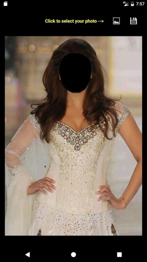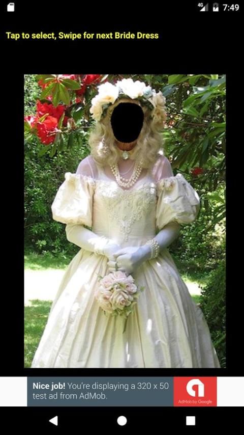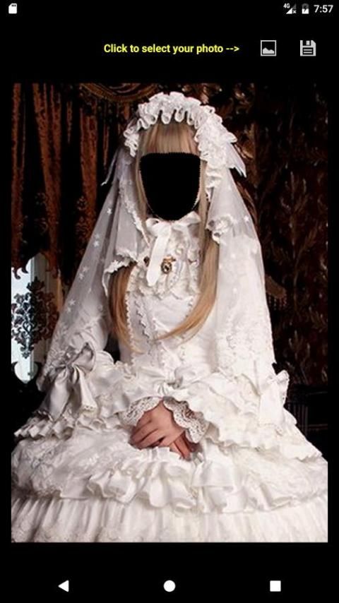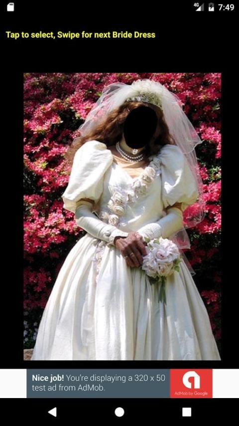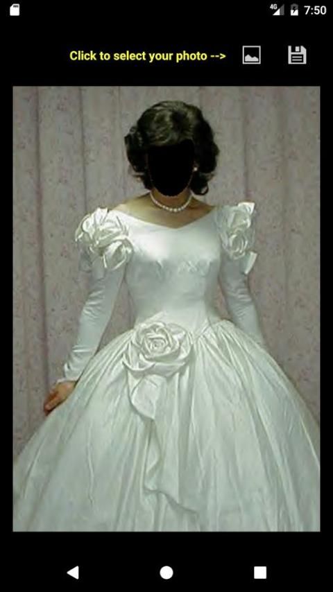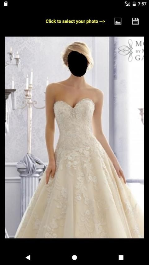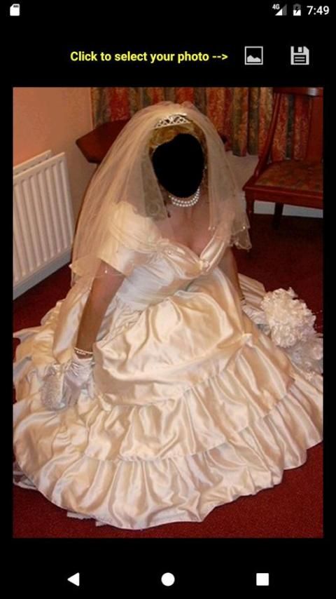 एक दुल्हन गाउन का चयन करें, गैलरी से अपनी तस्वीर का चयन करें, अपने चेहरे को समायोजित करने और बचाने के लिए। किया हुआ!