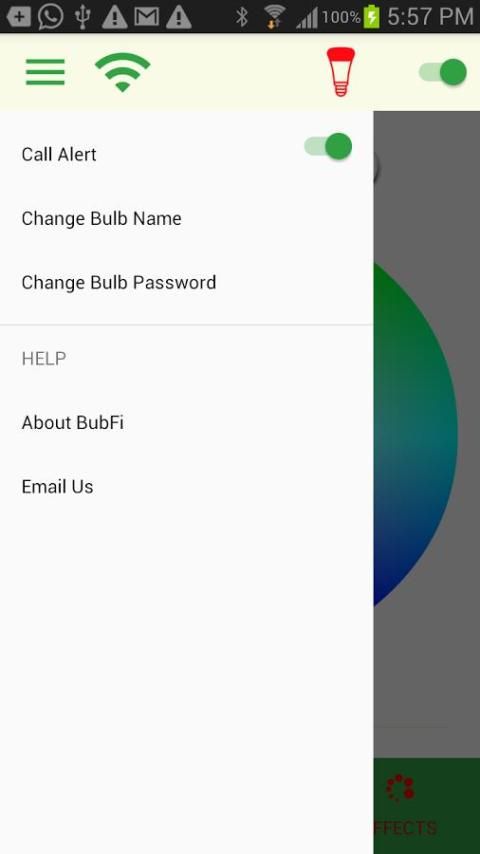 • अनुप्रयोग मुख्य स्क्रीन में रंग पट्टिका पर अपनी उंगली से स्क्रॉल BubFi वाईफ़ाई बल्ब का रंग बदलने के लिए
