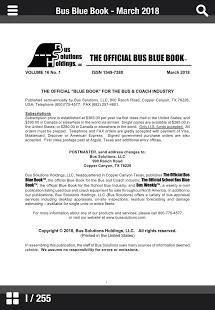 The Official Bus Blue Book™ is a complete used bus valuation guide. The book gives you benchmark pricing on thousands of used coaches throughout North America and Canada. In addition, the publication has great historical value providing information regarding both manufacturing dates and specifications. The Official Bus Blue Book™ is geared towards companies and individuals directly related to the Bus and Coach Industry.