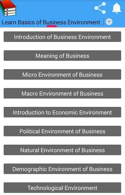 We have made this app for those students and managers who want to get knowledge of business environment more deeply. If you are students or manager of any company or doing own company based business, you must aware about business environment which is made from social, political, governmental, technical and economic environment. You should know every updates in it. According to external business environment, business needs to update its internal environment. So, this app will be helpful to teach all about these concepts.