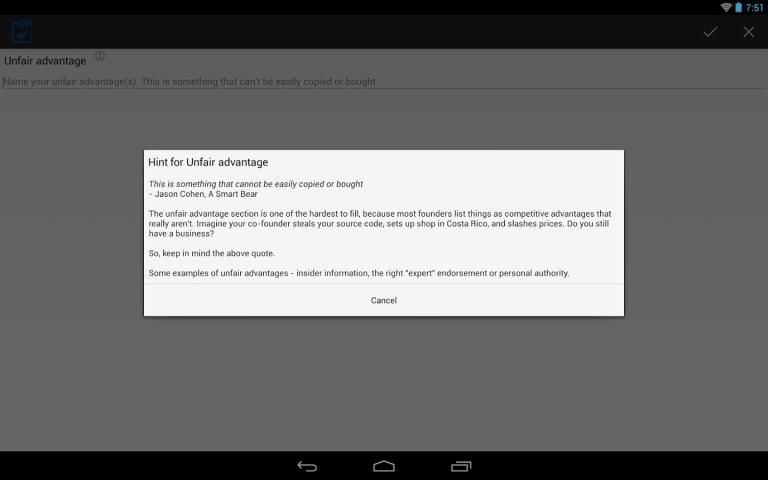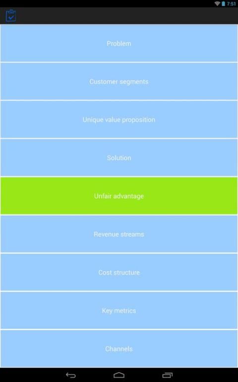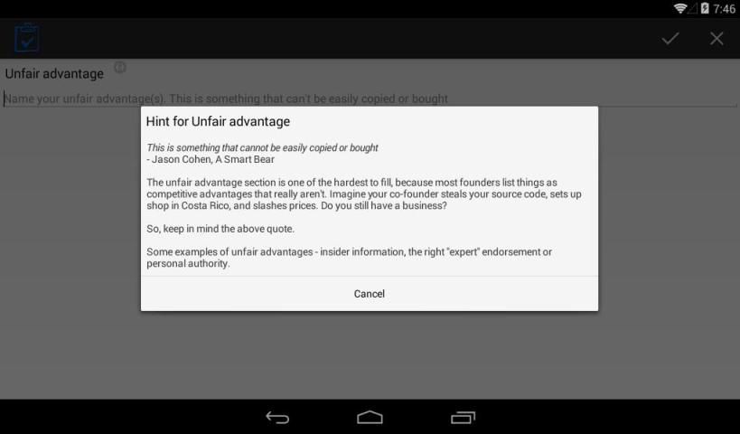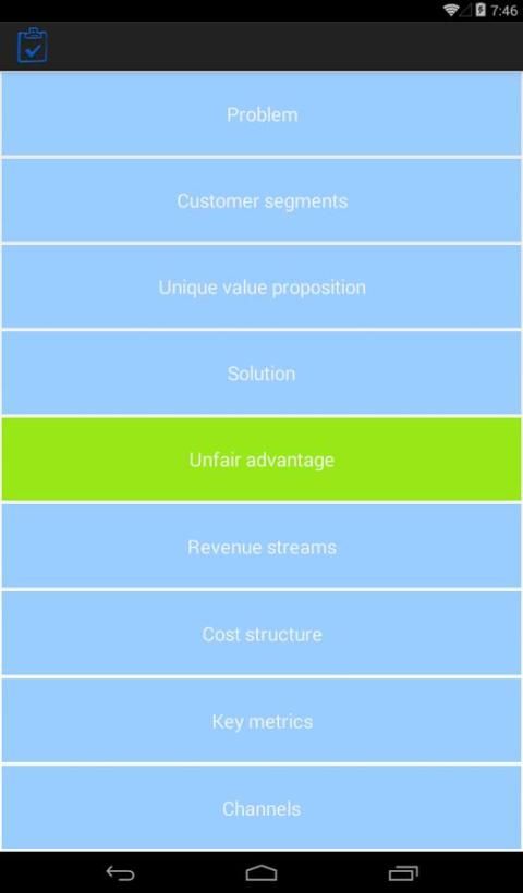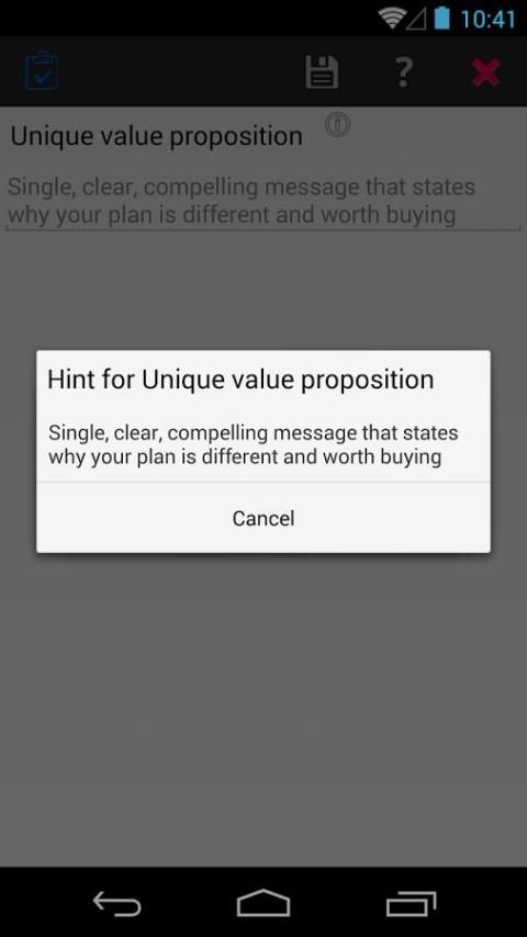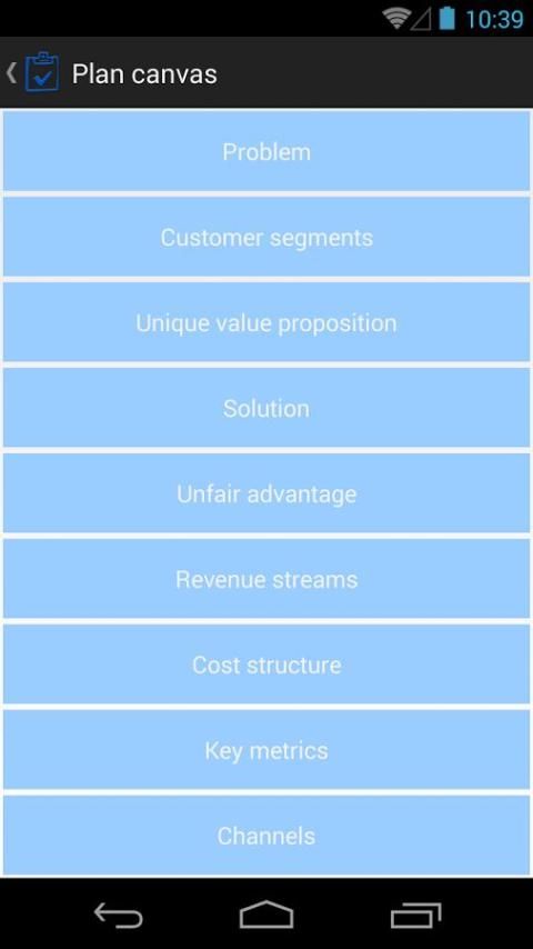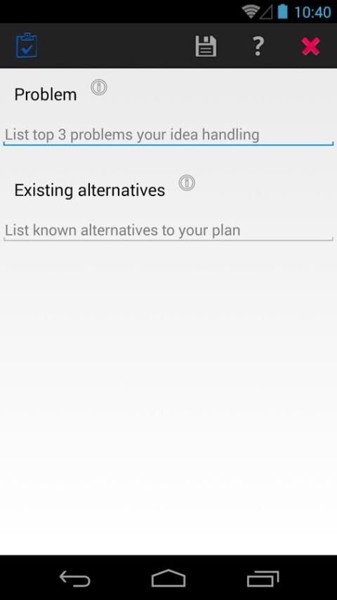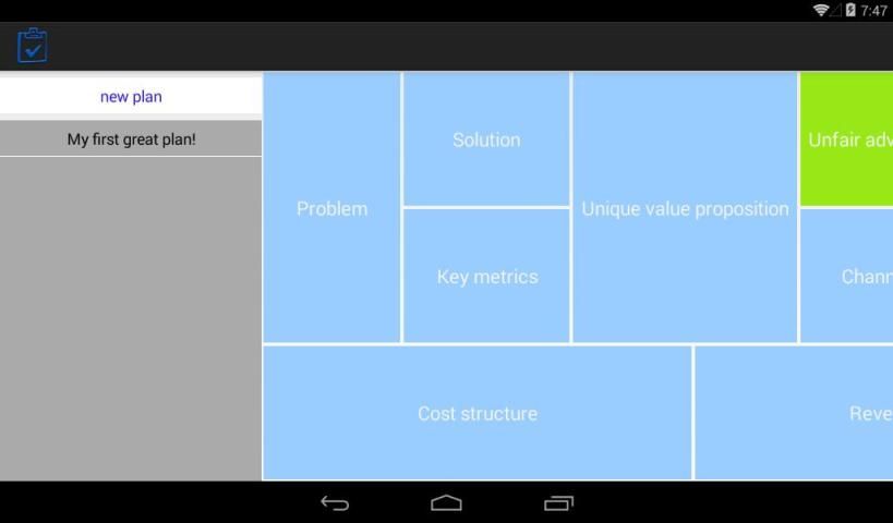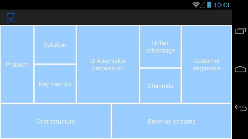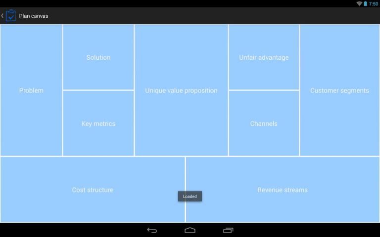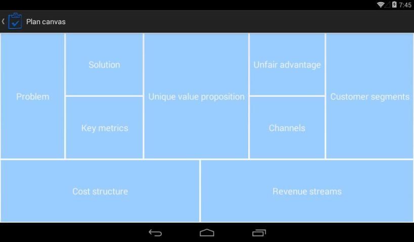 पहला विचार प्रलेखन के लिए समय कम करने के लिए, एलेक्स OSTERWALDER हम इस ऐप्लिकेशन में पेश जो ए 4 तालिका के साथ आया था. व्यावहारिक और सहायक संकेत का उपयोग कर, तालिका भरने, आप एक वास्तविक व्यापार की योजना के सभी महत्वपूर्ण कदम के माध्यम से जाना जाएगा.