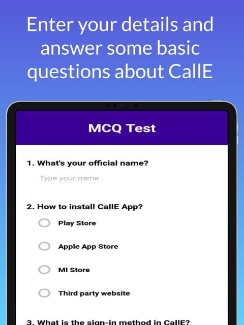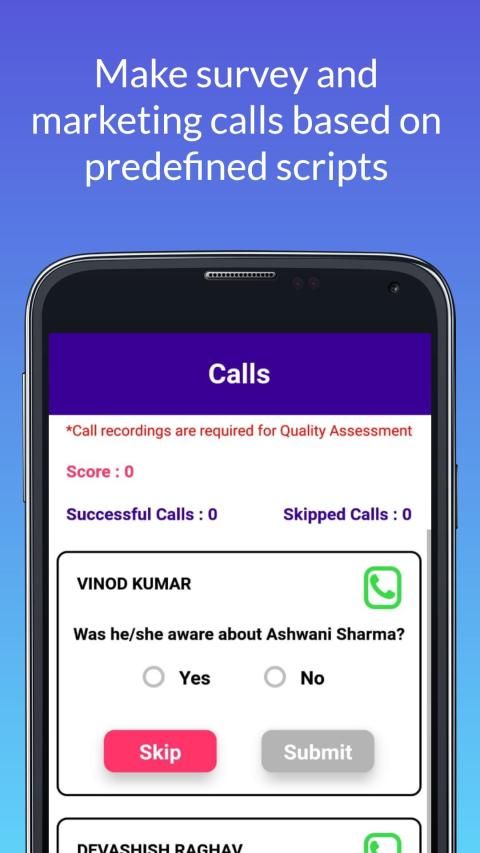 कार्य: अपने एंड्रॉइड फोन पर 'CallE' में लॉग इन करें, फोन कॉल करें और अपने जैसे लोगों से सर्वेक्षण या मार्केटिंग के बारे में बात करें जैसे: नेट प्रमोटर स्कोर सर्वेक्षण आयोजित करना, लोगों से मधुमेह के बारे में पूछताछ करना या उन्हें चुनाव के उम्मीदवार के लिए राजी करना।
