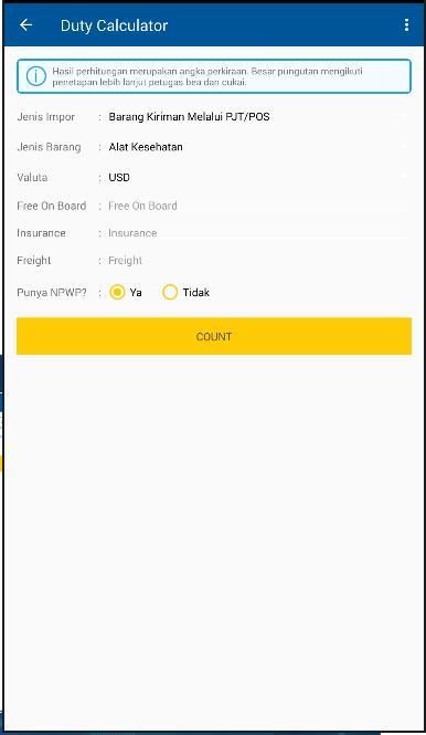 Merupakan simulasi penghitungan bea masuk dan pajak impor. Kalkulator ini telah disesuaikan dengan peraturan terbaru terkait aturan barang kiriman. Harap diperhatikan bahwa hitungan yang tercantum dalam kalkulator ini merupakan simulasi dan tidak dapat dijadikan sebagai dasar hukum. Penetapan bea masuk dan pajak impor menggunakan metode official assesment