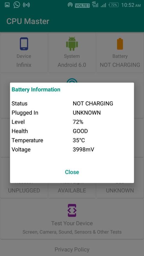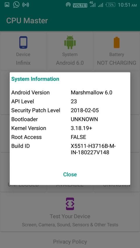 * Device Info: Model, Manufacturer, Chipset, Build Number and Android OS version.