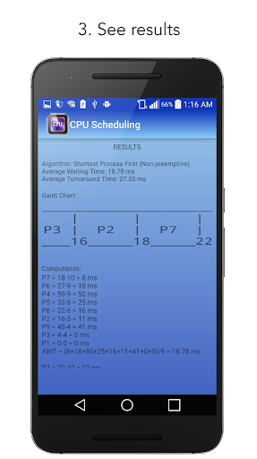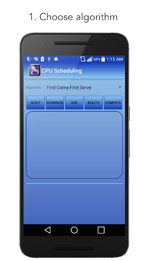 इस ऐप का मुख्य कार्य विभिन्न सीपीयू शेड्यूलिंग एल्गोरिदम को हल और ग्राफिंग कर रहा है। मान एक बार ग्राफ में प्लॉट करता है और यह आपको एल्गोरिदम देता है जो औसत प्रतीक्षा और टर्नअराउंड समय की गणना करता है।