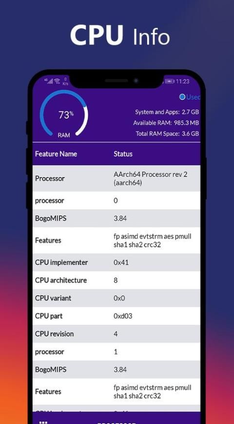 सीपीयू प्रो ऐप एक सरल और शक्तिशाली एंड्रॉइड एप्लिकेशन है जो आपको उन्नत उपयोगकर्ता इंटरफेस के साथ अपने फोन के बारे में पूरी जानकारी देता है। Device Info में Storage, OS, CPU, RAM, Sensors, Battery, SIM, Bluetooth, Installed Apps, System Apps, Display, Camera, आदि के बारे में जानकारी शामिल है।