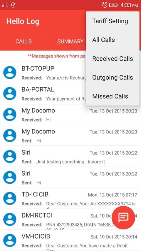 संदेश अनुभाग: एसएमएस पिछले एक महीने से सूचीबद्ध हैं। आप यहां से सीधे संदेश अनुप्रयोग में जाने के लिए कोई ज़रूरत नहीं एक संदेश भेज सकते हैं।