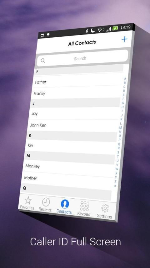 • कॉलर स्क्रीन संपर्क स्क्रीन आप अपने सभी संपर्क सूची है जिसमें आप अपने संपर्कों को खोज सकते हैं दे देंगे