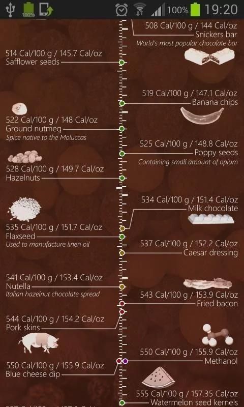 - एक त्वरित और मनोरंजक तरीके से विभिन्न खाद्य पदार्थ, पेय पदार्थ और ईंधन की कैलोरी सामग्री के बारे में जानने के लिए और कैसे वे वास्तव में एक दूसरे से तुलना