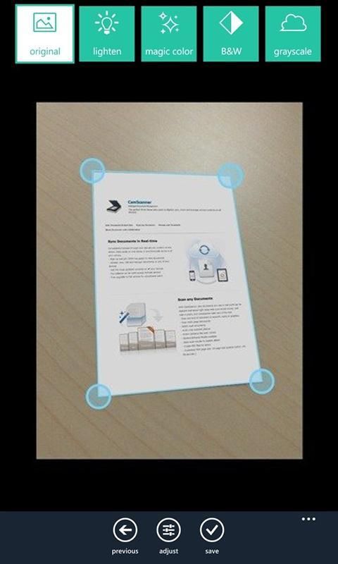 कैम स्कैन छवियों के स्मार्ट क्रॉपिंग में मदद करता है और ली गई छवियों को स्कैन करने के बाद कुरकुरा दस्तावेज़ बनाता है