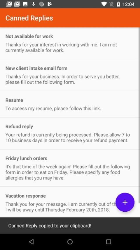 This Android app allows you to create, edit, and delete canned replies. Open the app to quickly copy to your clipboard with a single tap.