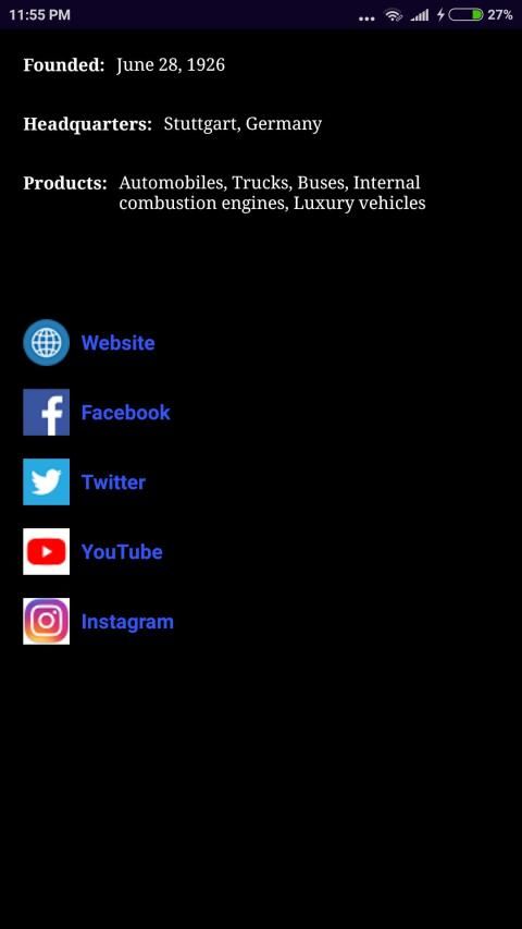 World's popular car/automobile brands have been integrated together in this app with their website along with top profiles like Facebook, Twitter, YouTube and Instagram. You can stay updated easily about these brands as reaching to these profiles are just one click away. Also there are some basic information given about these brands for knowledge related purpose.
