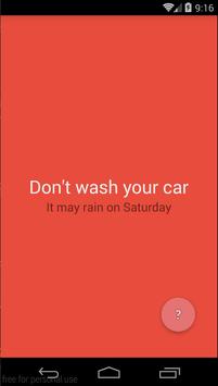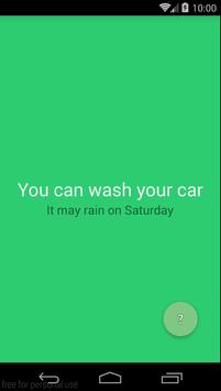 कारवाश ऐप आपको यह तय करने में मदद करेगा कि बारिश में पकड़े जाने के डर के बिना अपनी कार को धोने के लिए उचित है।ऐप आपके स्थान का पता लगाता है और मौसम पूर्वानुमान की जांच करता है।यदि आज या कल के लिए वर्षा की उम्मीद है, तो आपकी कार धोने की सिफारिश नहीं की गई है।ऐप पृष्ठभूमि आपको चेतावनी देने के लिए लाल हो जाएगी।यदि 2 या 3 दिनों में बारिश की भविष्यवाणी की जाती है तो ऐप कहता है कि आप अपनी कार को अपने जोखिम पर धो सकते हैं और पृष्ठभूमि नारंगी हो जाएगी।अन्य सभी मामलों में आप अपनी कार धोने के लिए स्वागत करते हैं और सुनिश्चित करें कि यह कई दिनों के लिए स्पार्कलिंग साफ रहेगा।