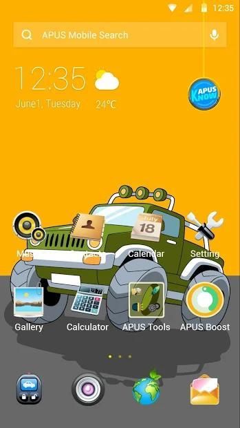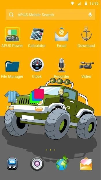 1. Cartoon Art Car Theme is free, but only compatible with APUS Launcher. If you want to apply it, please install APUS Launcher on your Android phone. Or download the theme and APUS Launcher. When you install APUS Launcher, there are variety of themes in APUS theme & wallpaper store, such as flower, butterfly, rose, gold, cool, cute cartoon monster, luxury gold business,black, simple, magic, sports(football,basketball,cricket),festival(Valentine's Day, New Year, Halloween, Christmas)、cute cat and dog, butterfly theme. Install APUS launcher to apply the cartoon theme. APUS can give you different style.
