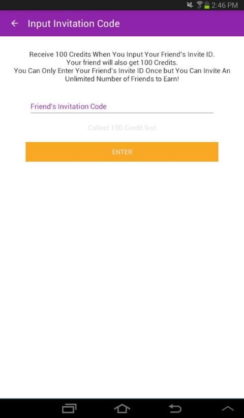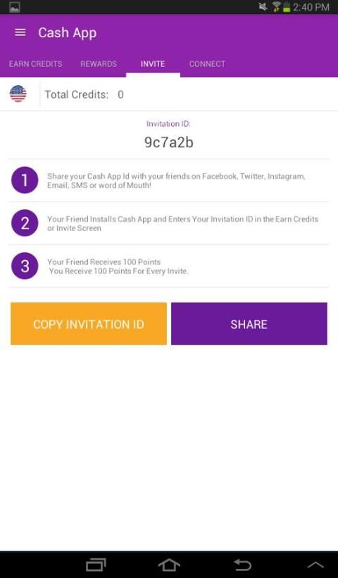 एक अतिरिक्त 100 क्रेडिट पाने के लिए नकद app करने के लिए अपने मित्रों को आमंत्रित करें, आप लोगों के एक असीमित संख्या में आमंत्रित कर सकते हैं और आप 100 क्रेडिट प्रत्येक और हर समय मिलता है! इसलिए वे 100 क्रेडिट भी प्राप्त कर सकते हैं इनपुट अपने निमंत्रण कोड के लिए उनसे पूछो!