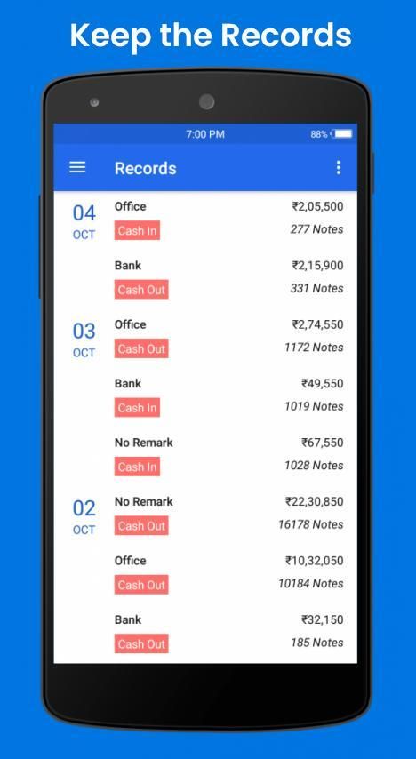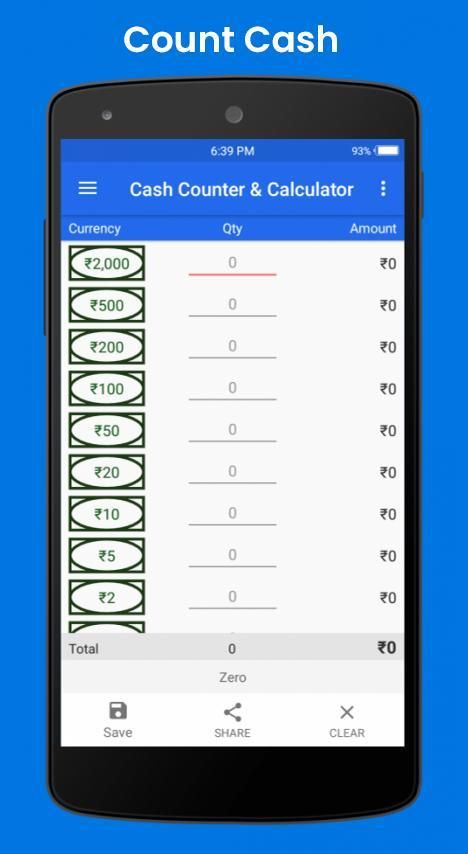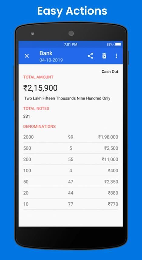 With this app, you can save your denominations and use them for future use. and you can share the denomination. This app makes counting cash very easy. it will show total sum and total notes which is useful for denominations such as the ones needed in the bank.