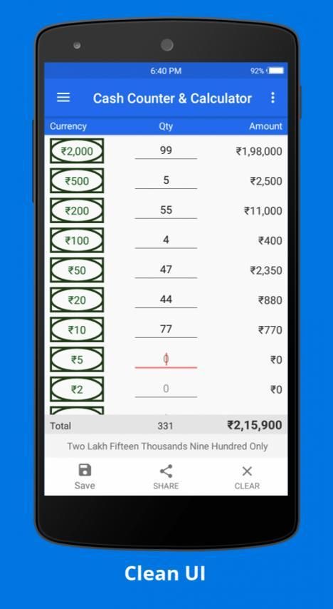 इस एप्लिकेशन के साथ, आप अपने संप्रदायों को बचा सकते हैं और भविष्य में उपयोग के लिए उनका उपयोग कर सकते हैं। और आप संप्रदाय को साझा कर सकते हैं। यह ऐप काउंटिंग कैश को बहुत आसान बनाता है। यह कुल योग और कुल नोट दिखाएगा जो मूल्यवर्ग के लिए उपयोगी है जैसे कि बैंक में आवश्यक हैं।