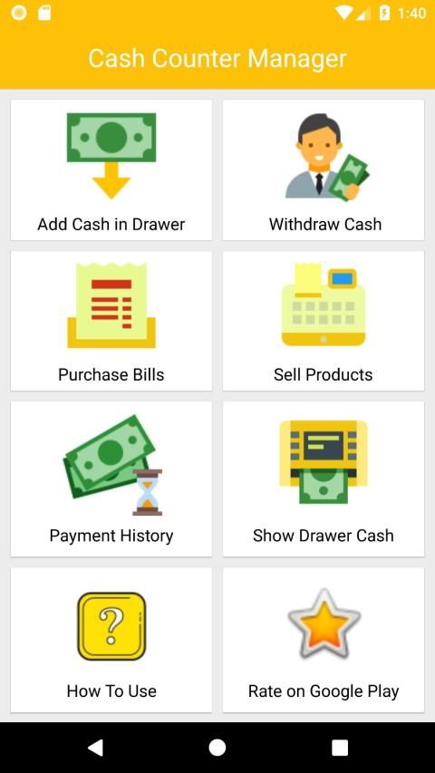 जब ग्राहक आपको आपके उत्पाद के लिए भुगतान करता है तो यह ऐप आपको अपने दराज में उपलब्ध नोटों के प्रभुत्व के साथ शेष राशि उसे वापस देने में मदद करता है।