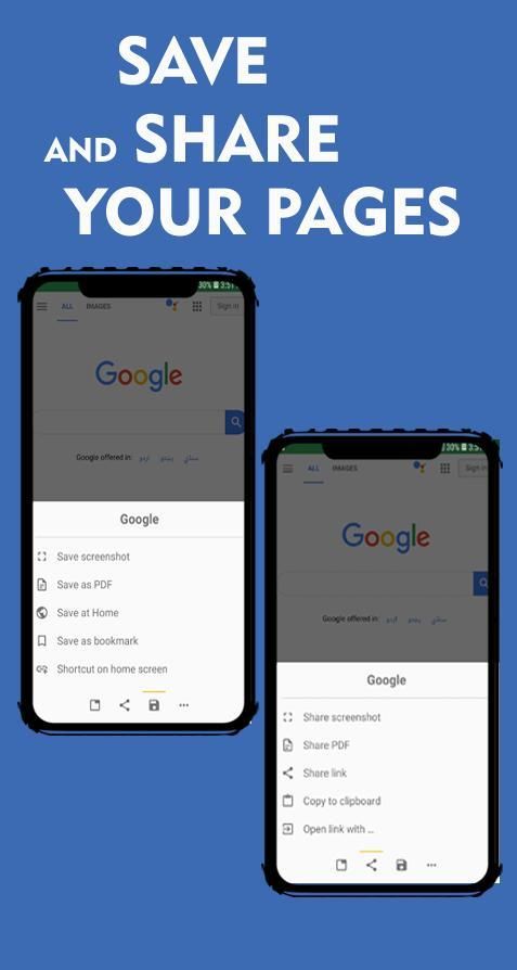 उपयोगकर्ता पृष्ठभूमि में लिंक खोल सकता है। आप स्क्रीनशॉट ले सकते हैं या आप पूरी वेबसाइट को एक पीडीएफ के रूप में सहेज सकते हैं। आप अन्य एप्लिकेशन में लिंक खोल सकते हैं (उदाहरण के लिए youtube)