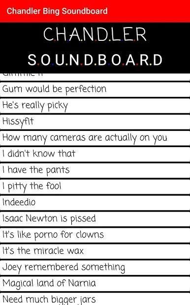 We access you a main official website for app download. 20,000+ users downloaded Chandler Bing Soundboard latest version on 9Apps for free every week! All its functions are there and updated. This hot app was released on 2018-08-30. That’s it! You’re done?