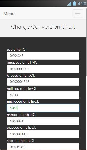 प्रभारी रूपांतरण चार्ट: Coulomb, megacoulomb, kilocoulomb, millicoulomb, microcoulomb, nanocoulomb, picocoulomb, abcoulomb, प्रभार से ईएमयू, statcoulomb, आदि