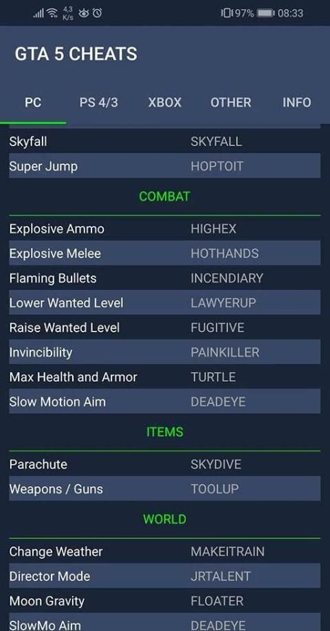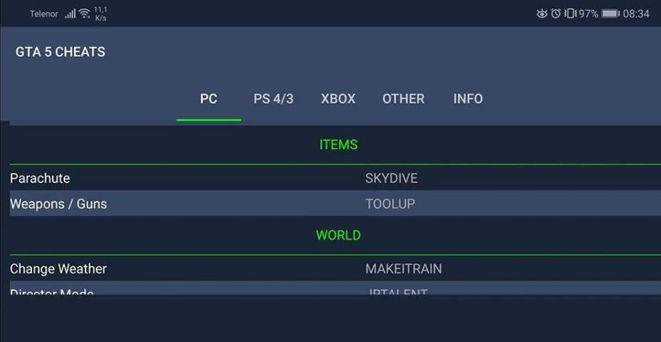 Here are shown CODES for PC, PS and XBOX for popular game GTA 5. Cheats could be found on the internet, but it is more convenient here to look and play. We also include, first hint for gaining more money in game, one of a kind. Layout is simple, there is no ads, except a small banner at the bottom. If you can, click on it and support furthure development. Also, check other applications from me.