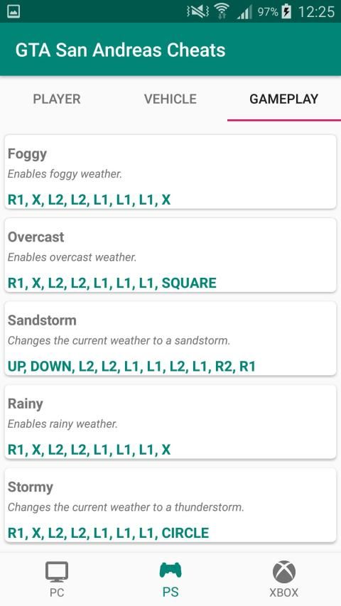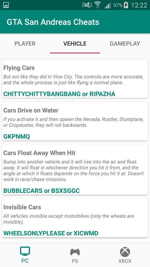 Cheat codes for GTA San Andreas are listed with guides. PC, Xbox, and Play Station versions are all included.