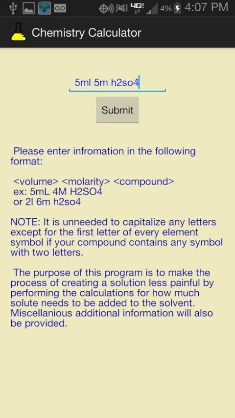इस कार्यक्रम का उद्देश्य \ N विलायक में जोड़ा होना कितना घुला हुआ पदार्थ की जरूरत के लिए गणना प्रदर्शन द्वारा कम दर्दनाक एक समाधान बनाने की प्रक्रिया बनाने के लिए है. विविध अतिरिक्त जानकारी भी प्रदान की जाएगी.