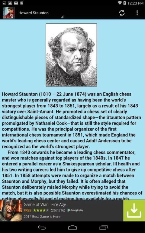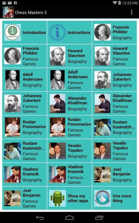 इस आवेदन के प्रयोजन के सबसे प्रसिद्ध शतरंज ग्रैंड मास्टर्स के दस अधिक के जीवन के साथ दर्शक परिचित कराने के लिए है. एक संक्षिप्त जीवनी के साथ साथ प्रत्येक का एक चित्र वर्षों में उनके द्वारा निभाई खेल के सैकड़ों में से किसी के माध्यम से कदम के लिए उपयोगकर्ता परमिट कि एक अविश्वसनीय वेब साइट (Chessgames.com) के लिए एक कड़ी के रूप में भी उपलब्ध है.