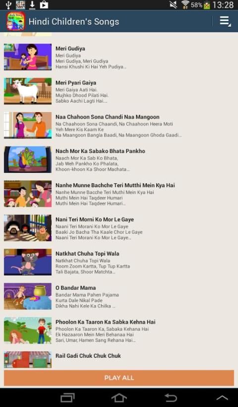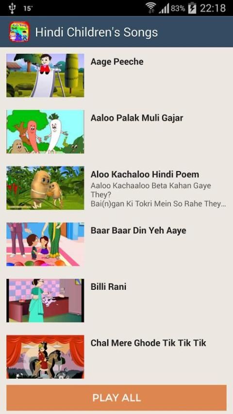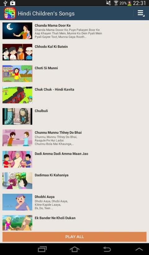 एप्लिकेशन को वर्तमान में 50 + लोकप्रिय हिंदी किड्स गाने सूचीबद्ध करता है. विदेशों में रह रहे भारतीयों को अपने बच्चों को हिंदी सीखने में मदद कर सकते हैं और भारतीय संस्कृति के बारे में - उन्हें अपनी जड़ों के साथ ही उनके विस्तारित परिवार के साथ बांड के साथ जुड़े रहने में मदद करेगा.