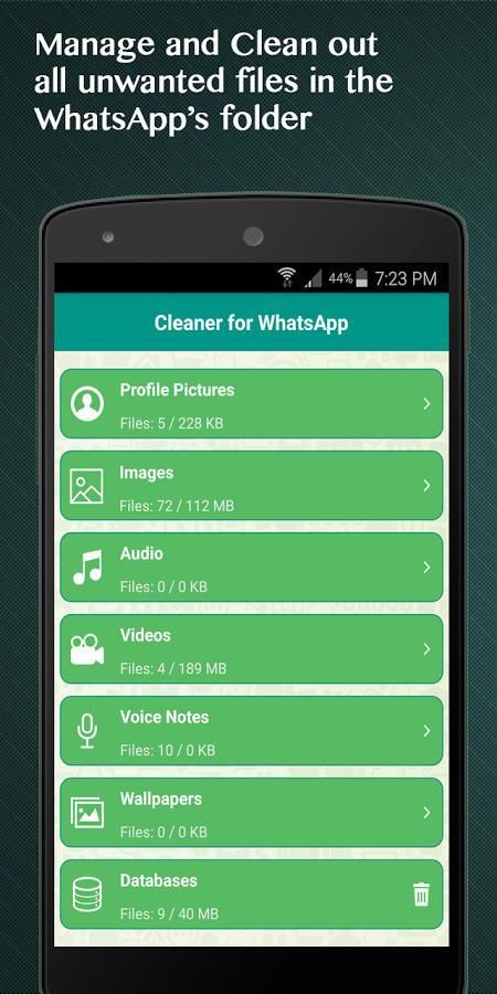WhatsApp के लिए क्लीनर सभी जगह लेने वाली ऐसी प्राप्त की और भेजा चित्र, ऑडियो, वीडियो, आवाज नोट, प्रोफ़ाइल चित्र और अन्य डेटाबेस कीमती अंतरिक्ष लेने के रूप में WhatsApp फाइलें, के लिए अपनी डिवाइस को साफ करेंगे।
