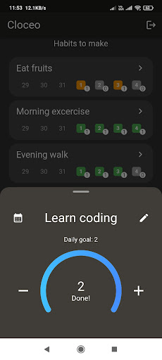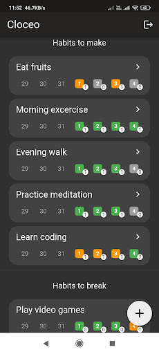 Cloceo आपको अच्छी आदतों को बनाने और बनाए रखने में मदद करता है, जिससे आप अपने दीर्घकालिक लक्ष्यों को प्राप्त कर सकते हैं।कैलेंडर और आँकड़े आपको दिखाते हैं कि समय के साथ आपकी आदतें कैसे सुधरे।ऐप पूरी तरह से विज्ञापन-मुक्त है और यह आपकी गोपनीयता का सम्मान करता है।