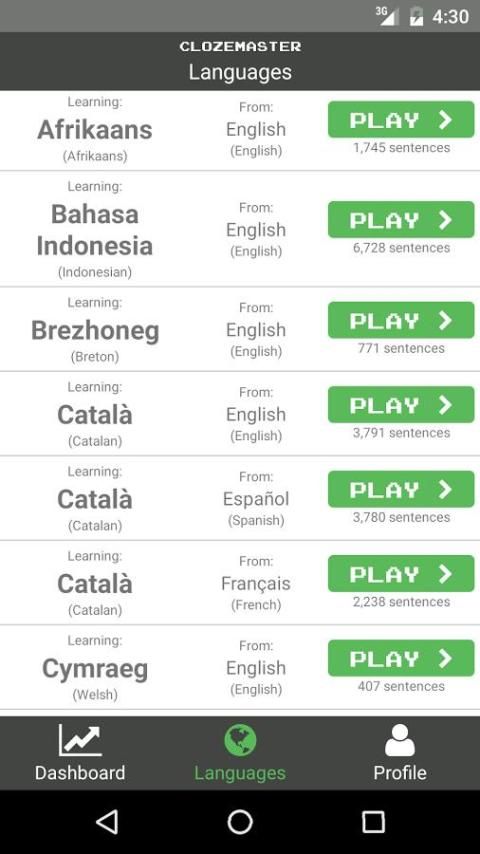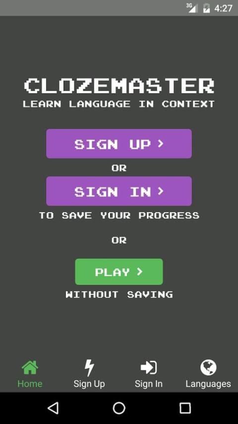 Clozemaster संदर्भ में शब्दावली के लिए बड़े पैमाने पर निवेश के माध्यम से सीखने की भाषा gamified है। साइन अप करने और खेलने के लिए नि: शुल्क! महान पोस्ट-Duolingo एप्लिकेशन और किसी भी स्तर पर भाषा सीखने के लिए महान पूरक।