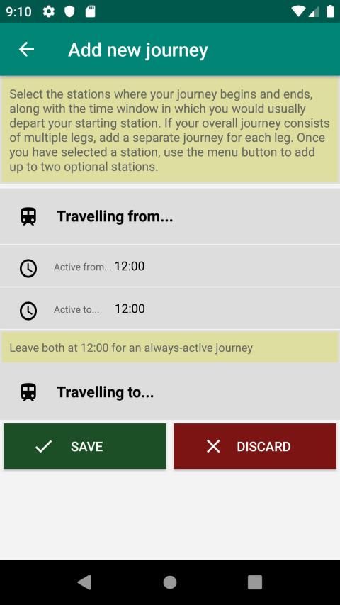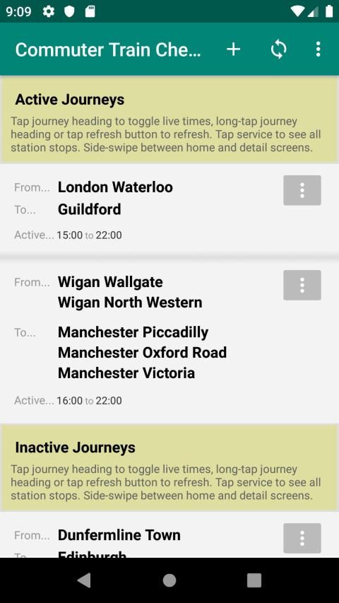 Designed with the train commuter in mind, you can set up your regular journeys, specifying the time windows in which you would usually make them. Depending on the time of day that you open the app, the journeys applicable at that time (the "active" journeys) will be presented first. In other words, the train you will be interested in at that time will be at your fingertips upon opening the app.