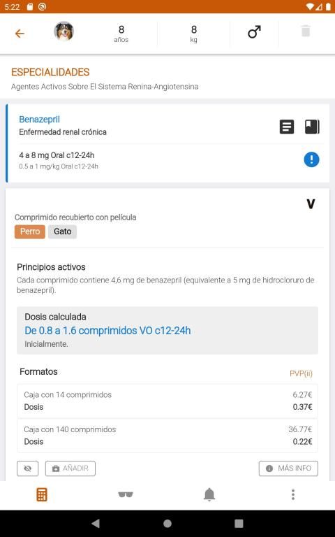 Por otra parte, ConsultaVet App ofrece información terapéutica únicamente sobre animales no productores de alimentos, con posibilidad de cálculo de dosis orientativas y generales en función de la especie y el peso.
