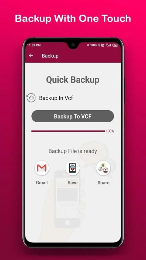 Quick contact backup with one click. My contact list backup will provide quick .VCF file to share and save within your device.